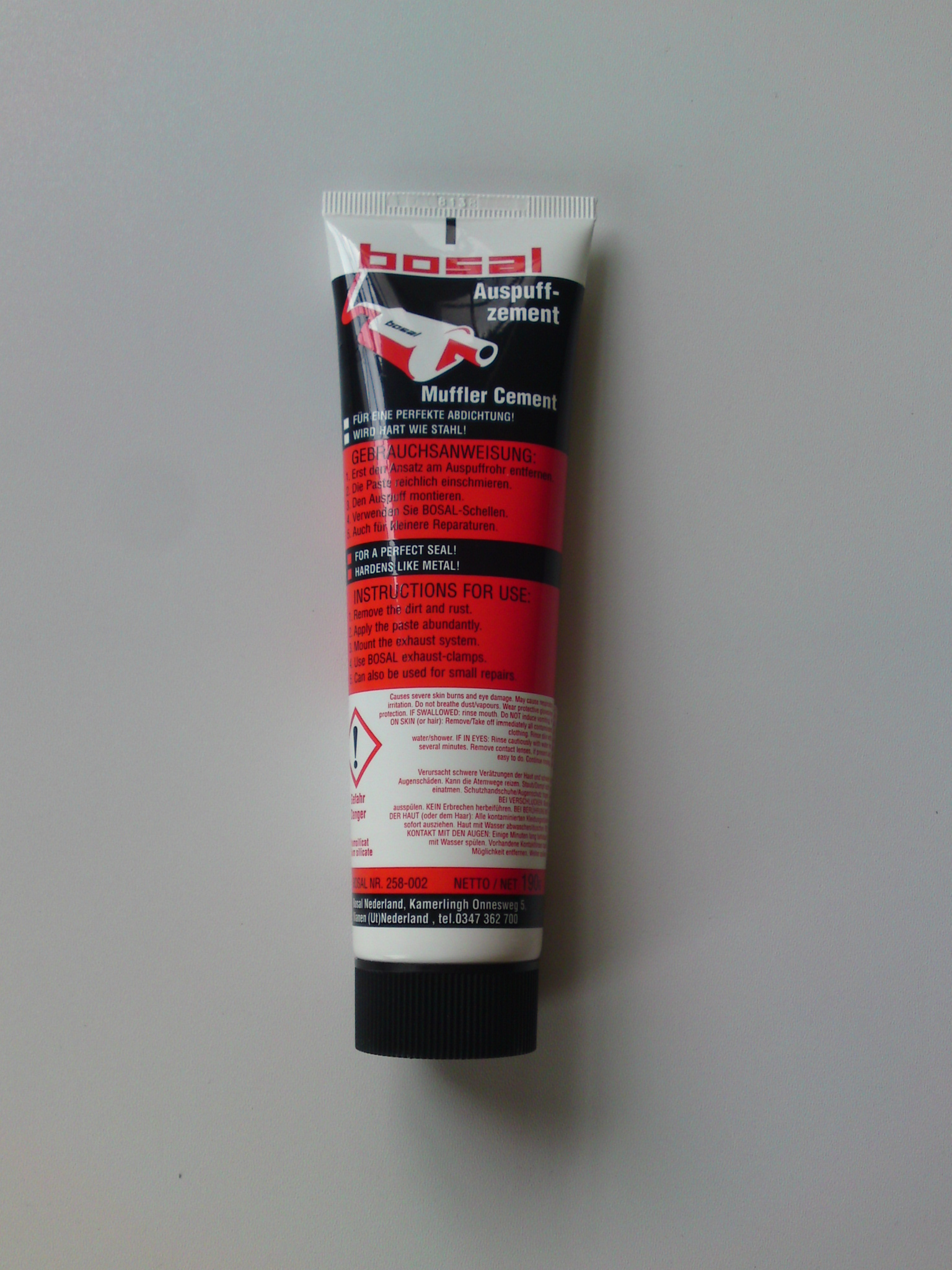 Bosal kipufogó tömítő paszta a kipufogó berendezés egyszerű, olcsó és gyors javítására a kipufogó elemek cseréjénél tömítésre szolgál. Azbeszt- és oldószermentes, környezetkímélő, hőálló és gáztömör javítást biztosít kisebb lyukak és repedések esetében. Hőre keményedik, könnyedén és egyszerűen alkalmazható prémium minőségű termék.