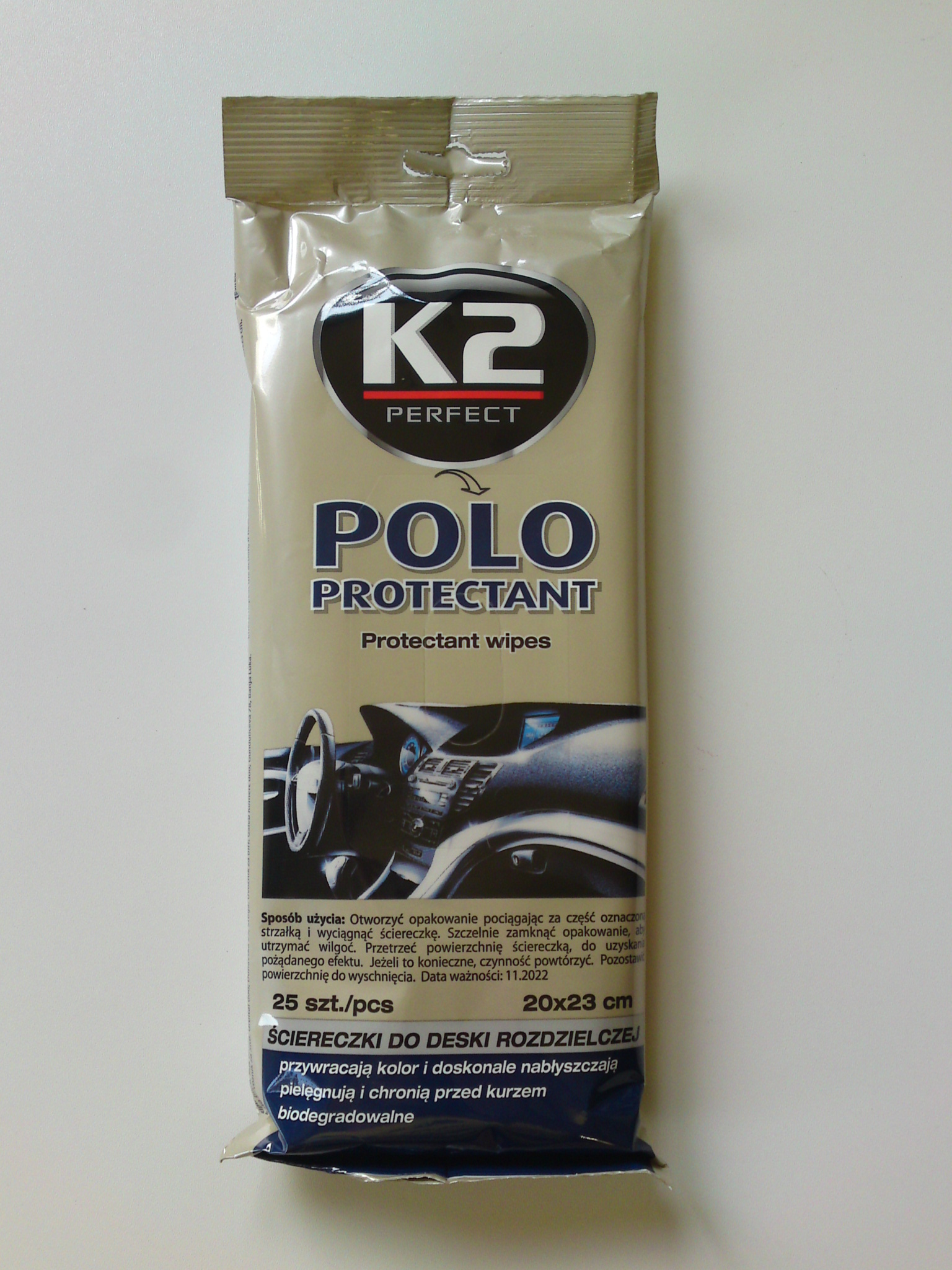 A gépjárművek műszerfalának és egyéb műanyag felületeinek tisztítására szolgáló semleges illatú, antisztatikus törlőkendő, visszazárható csomagolásban.